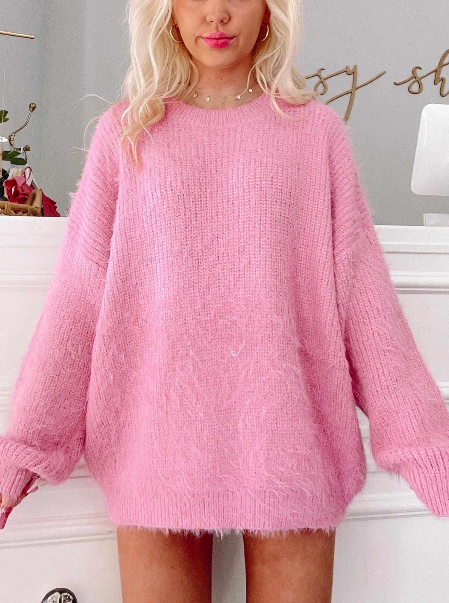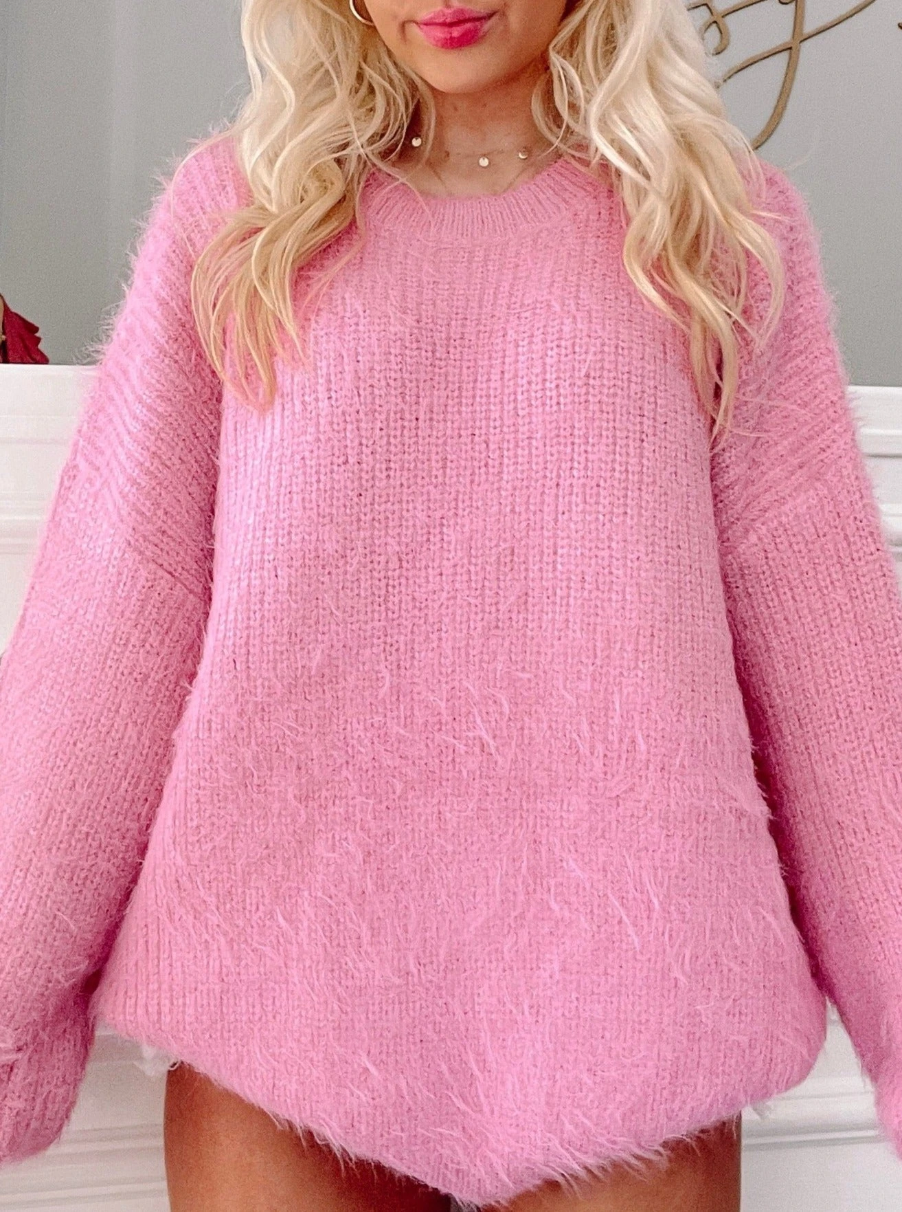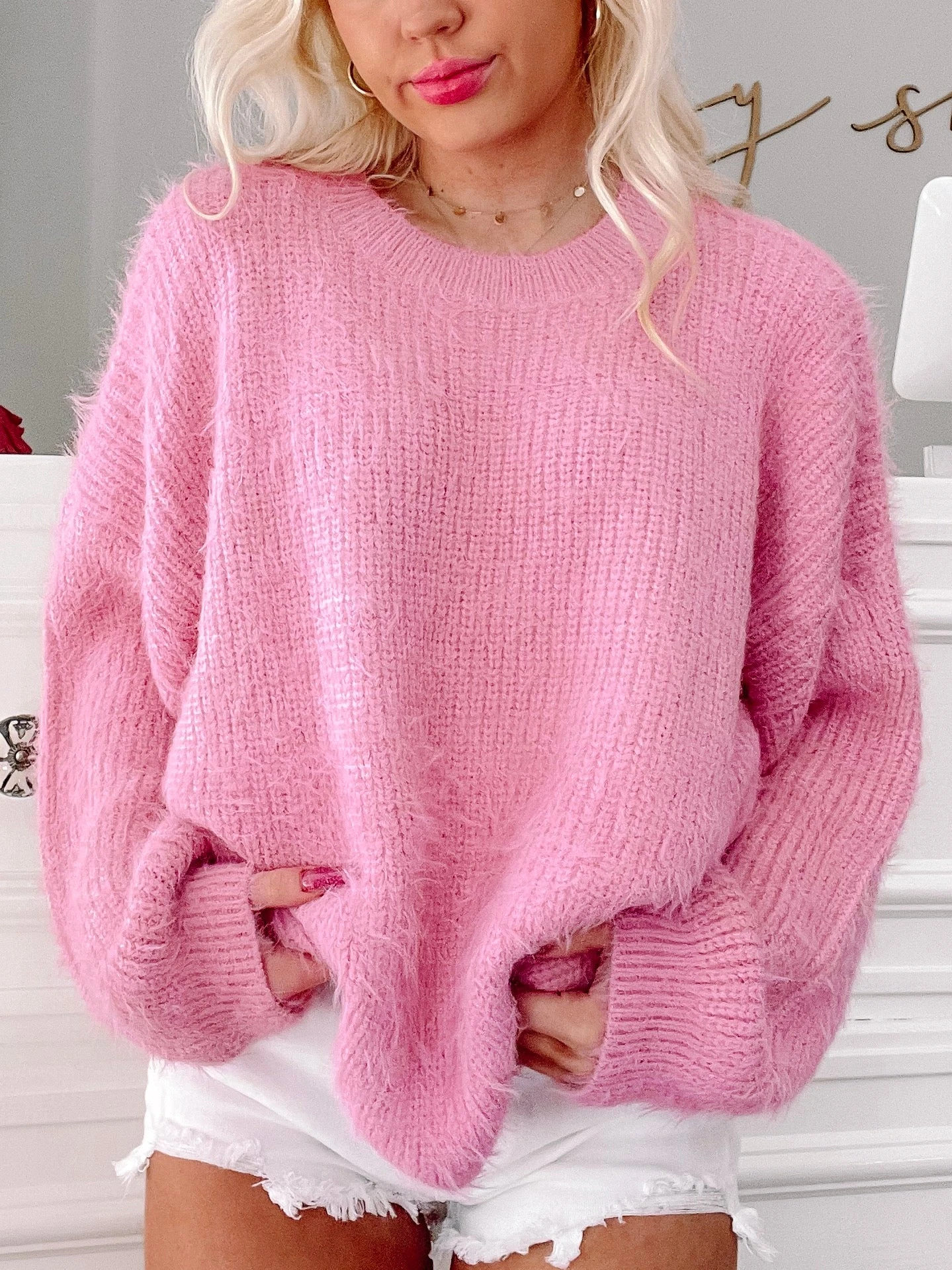 The Emory Sweater is a pink fuzzy eyelash sweater from Sassy Shortcake. This pink pretty is super soft, lightweight, and comfy!Â