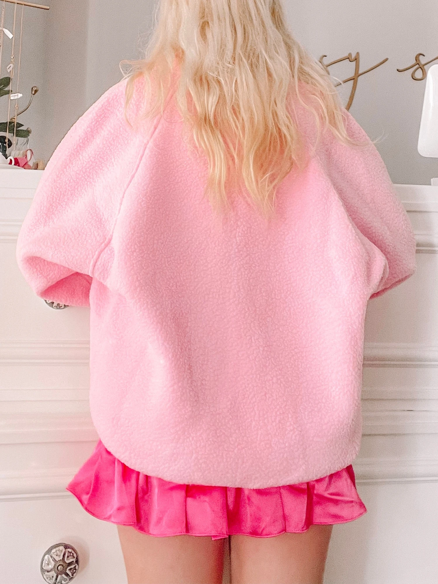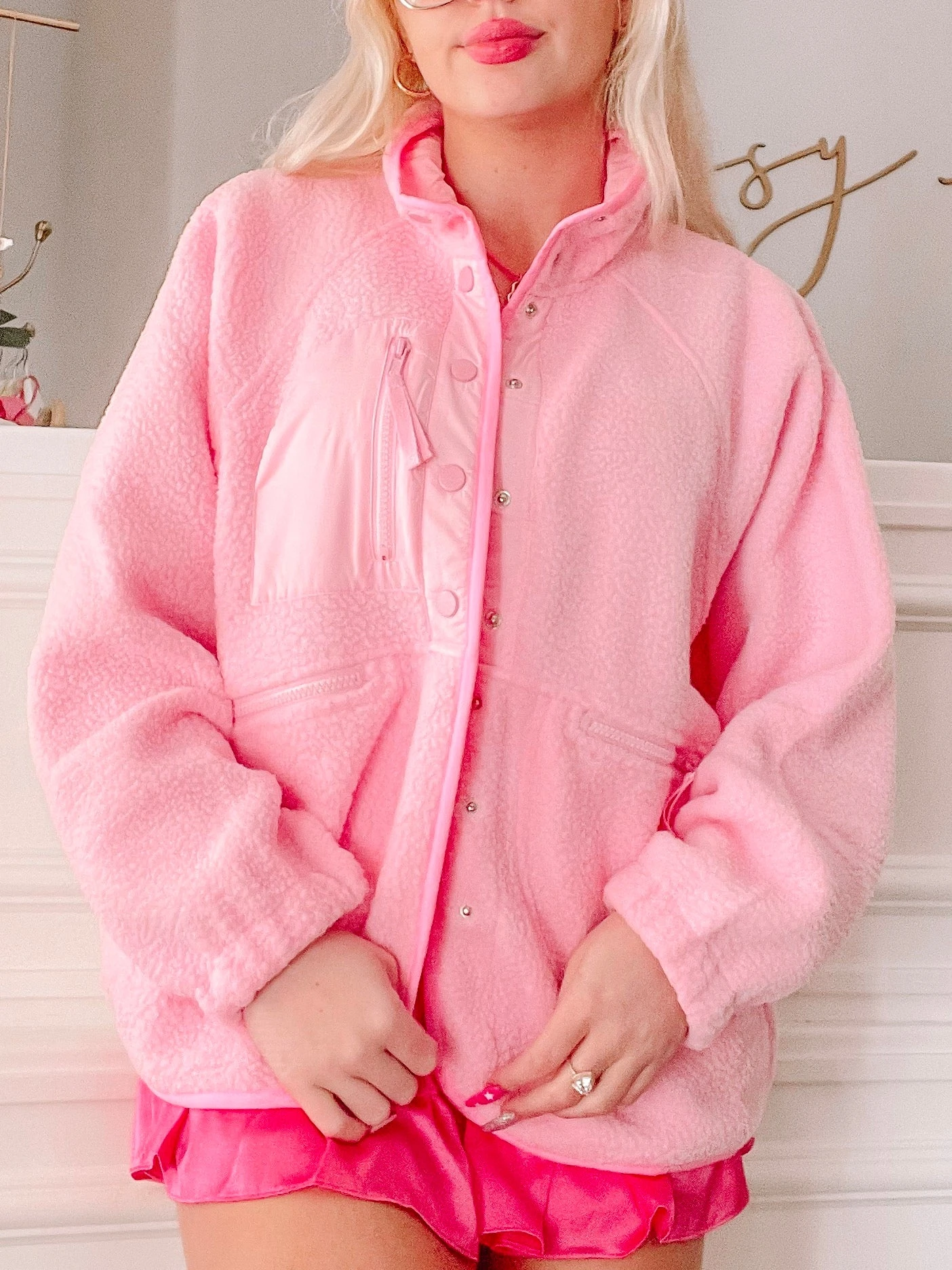 Our Heartbreaker Bubblegum Pink Jacket features a front zipper and snap button closure. It also has pockets!!Â