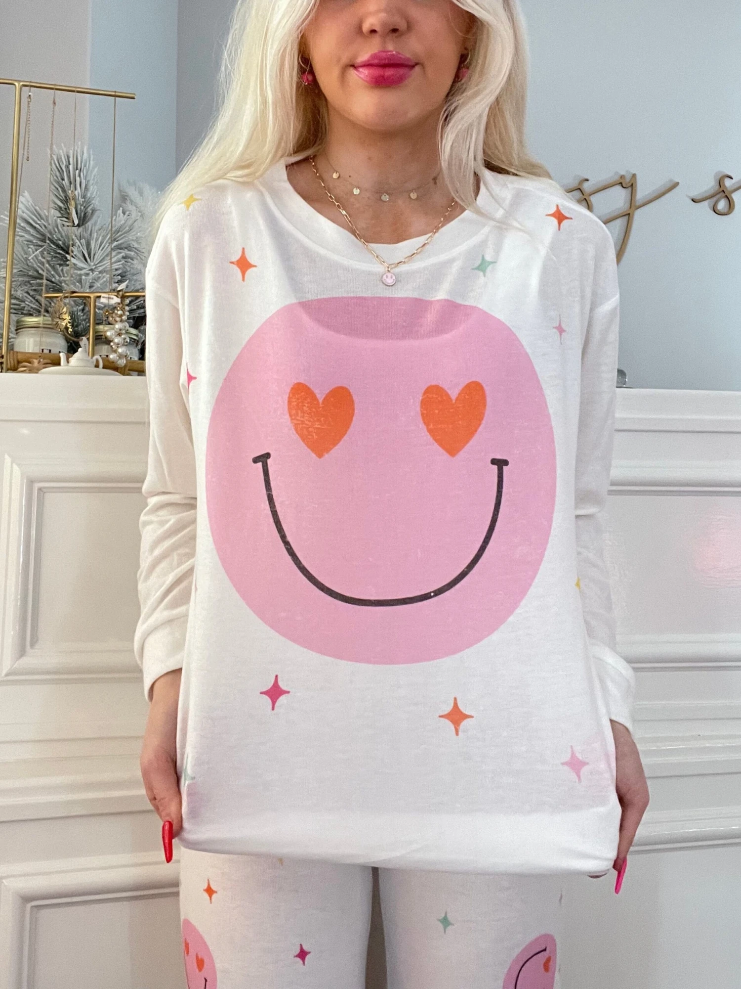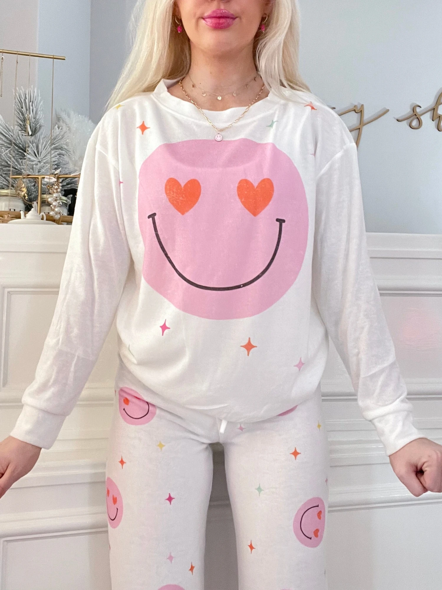 Our Hearts and Charms Smiley PJ Set in white is super soft and comfy to lounge around! Hearts act as the smiley face eyes on the top. Also available in light pink!Â