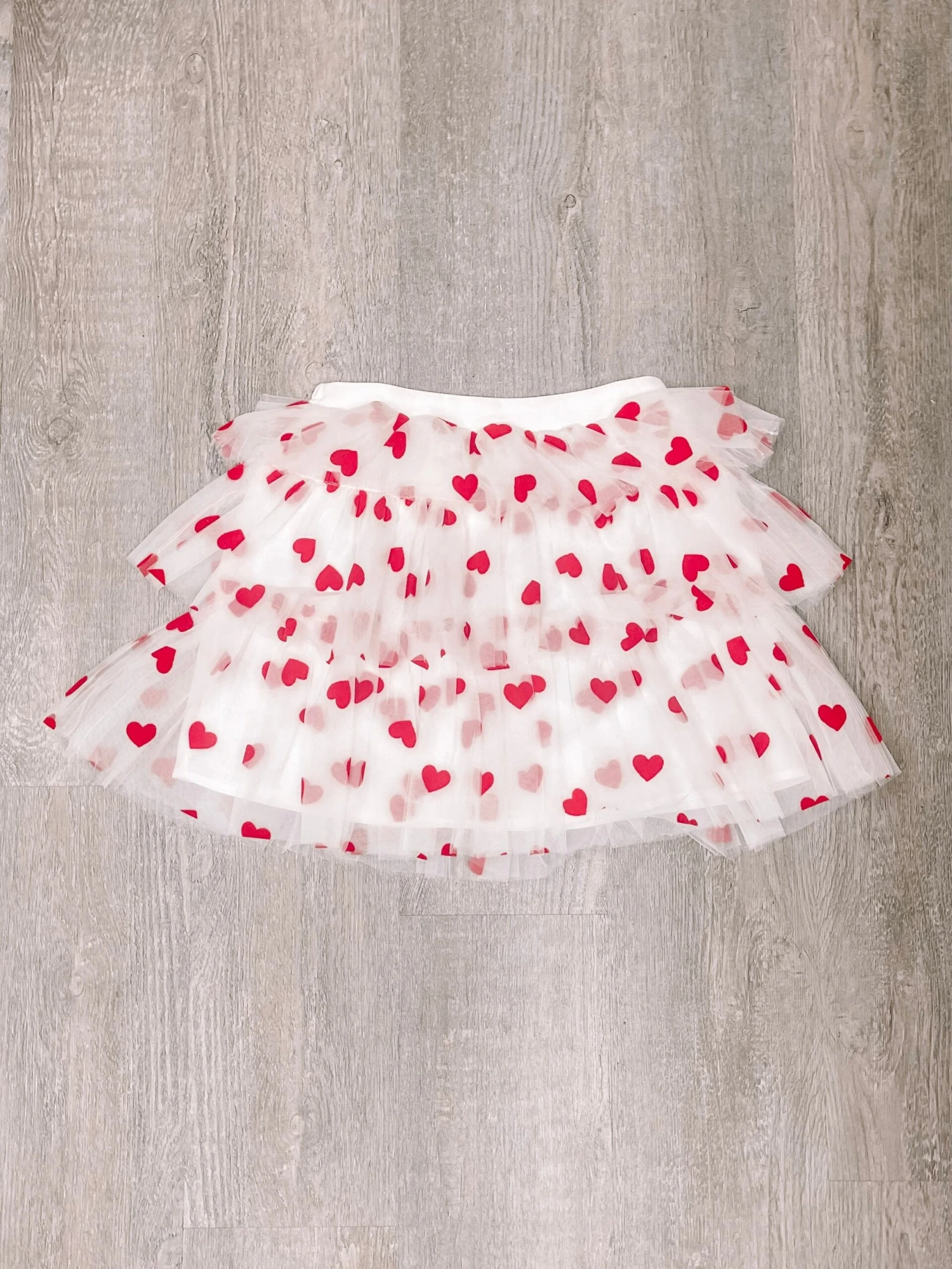 The Layers Of Love Heart Skirt from Sassy Shortcake is a tiered ruffle white tulle skort sprinkled with red hearts. She features an elastic waistband. Lined.