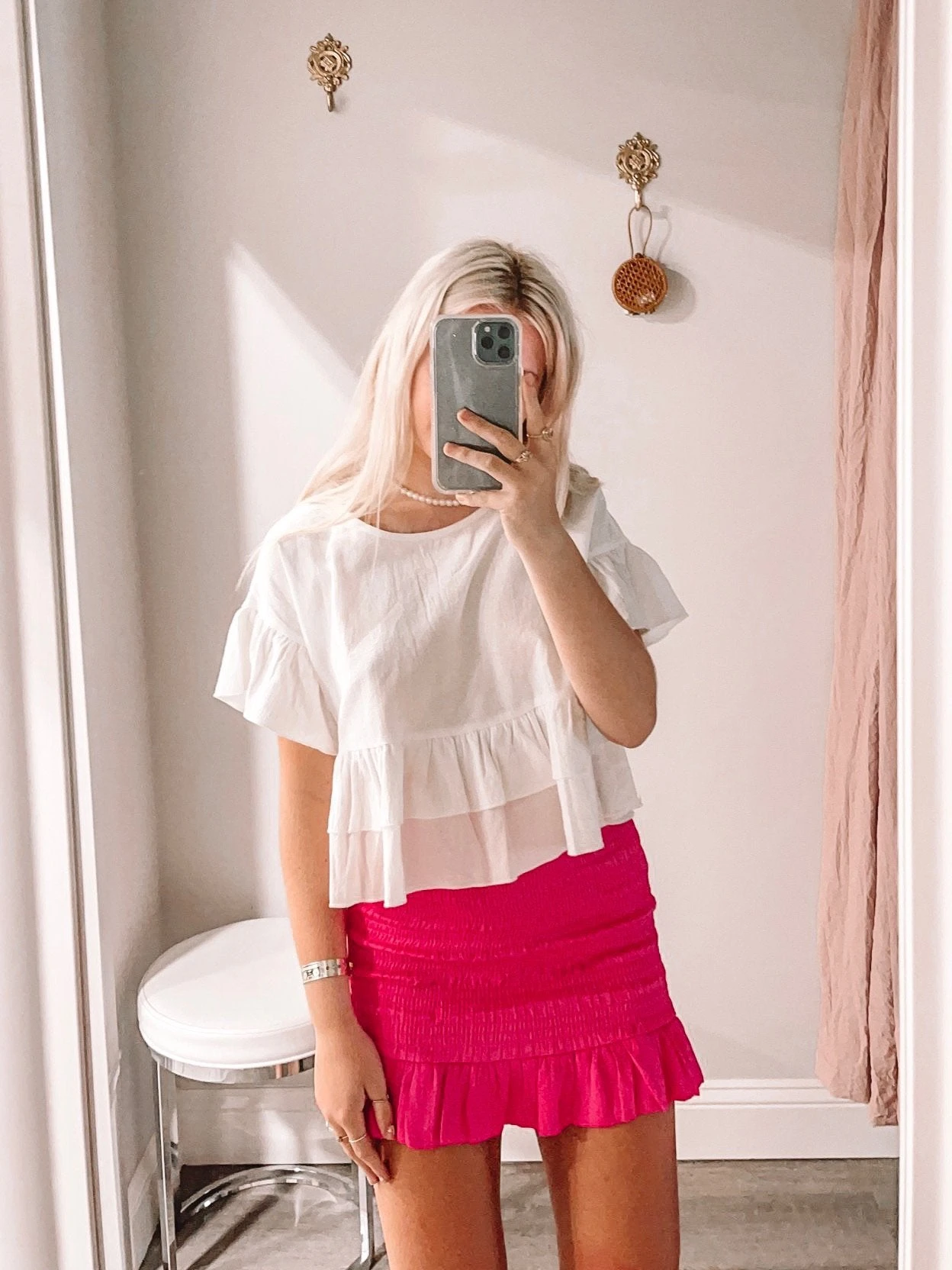 Our Malibu Barbie Hot Pink Smocked Skirt features a gorgeous ruffle hem as well as a mini ruffle trim around the top of the waistband.Â