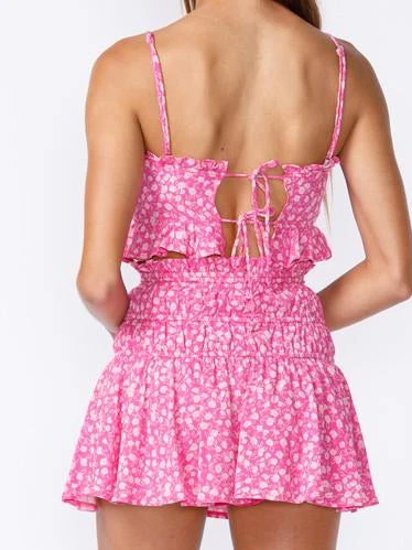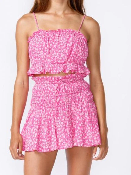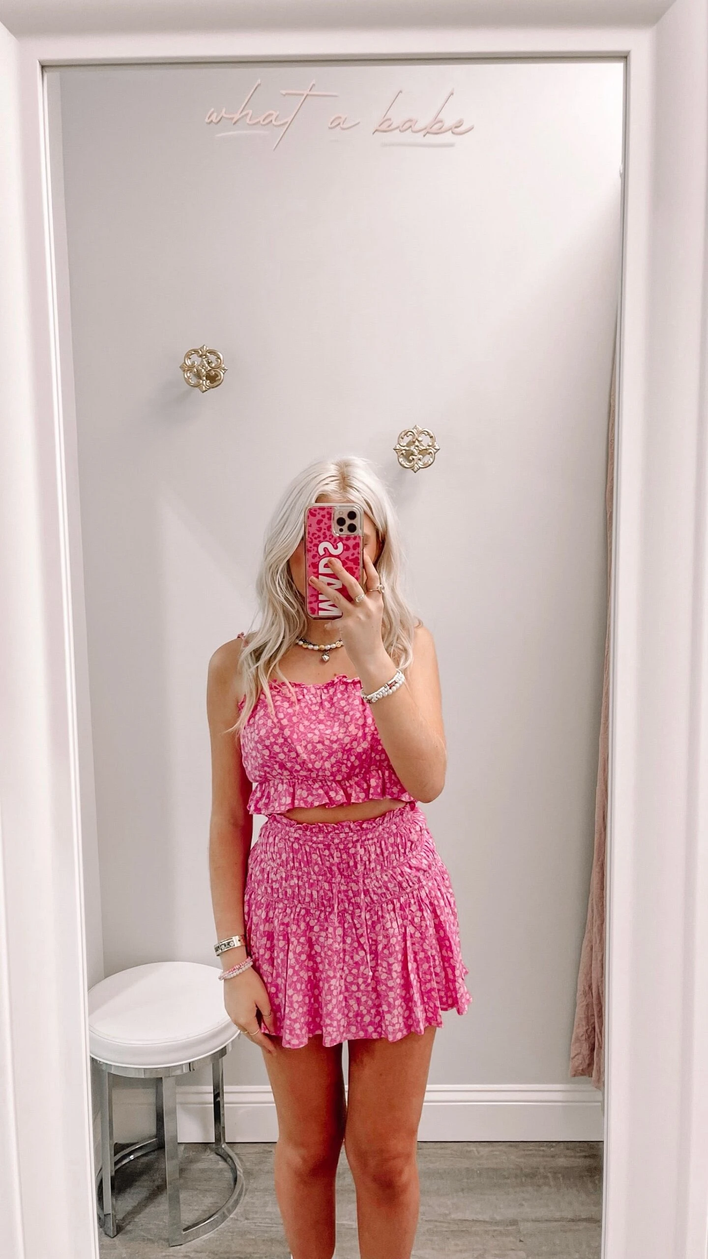 Our Perfect in Pink Skirt is a bright and bubbly hot pink skirt with a soft pink floral pattern.  This mini features a comfortable drawstring waistband, ruffle frill smocking along the top, and lining inside to be sure it’s not see through! The matching top is also available.