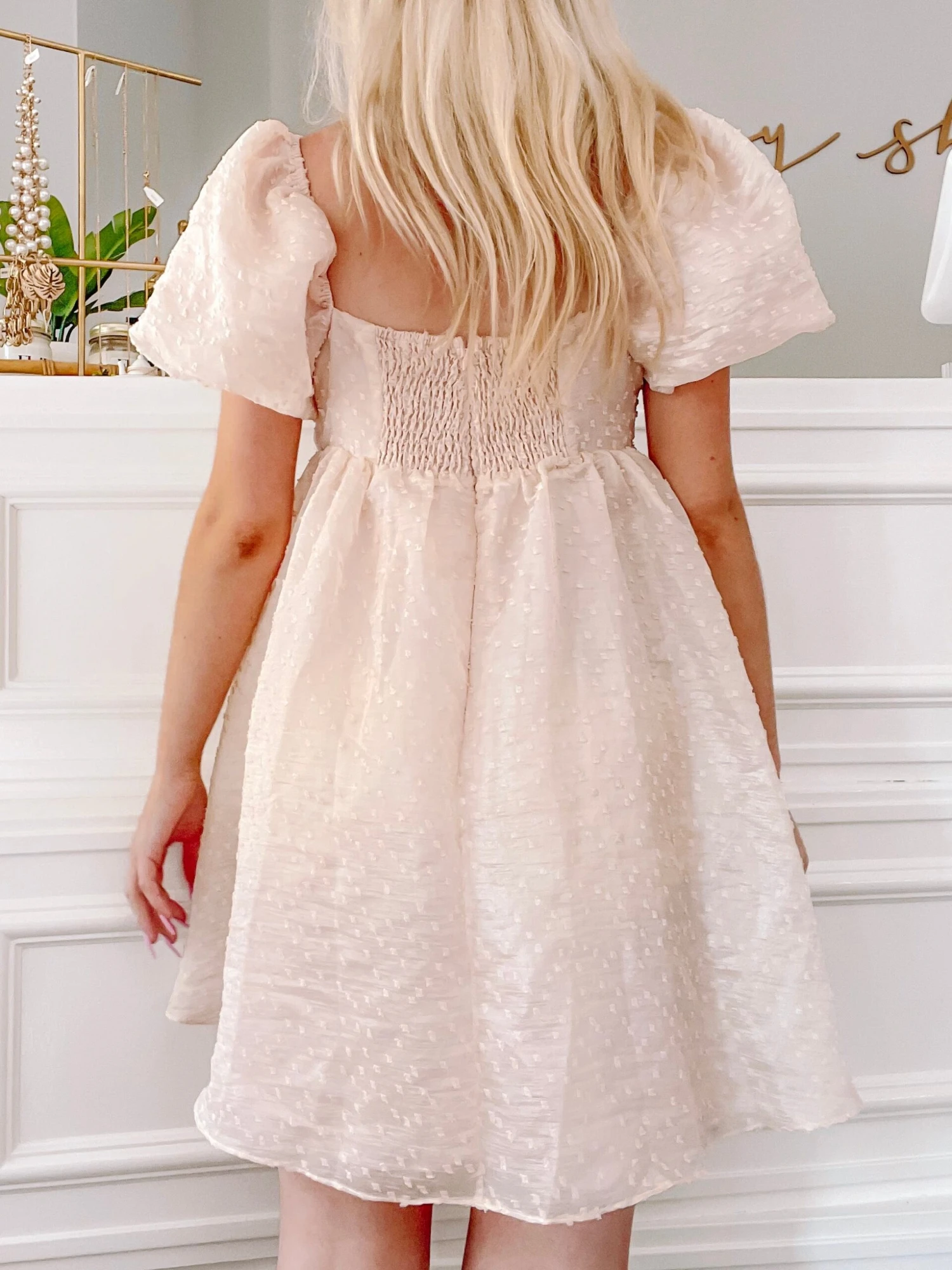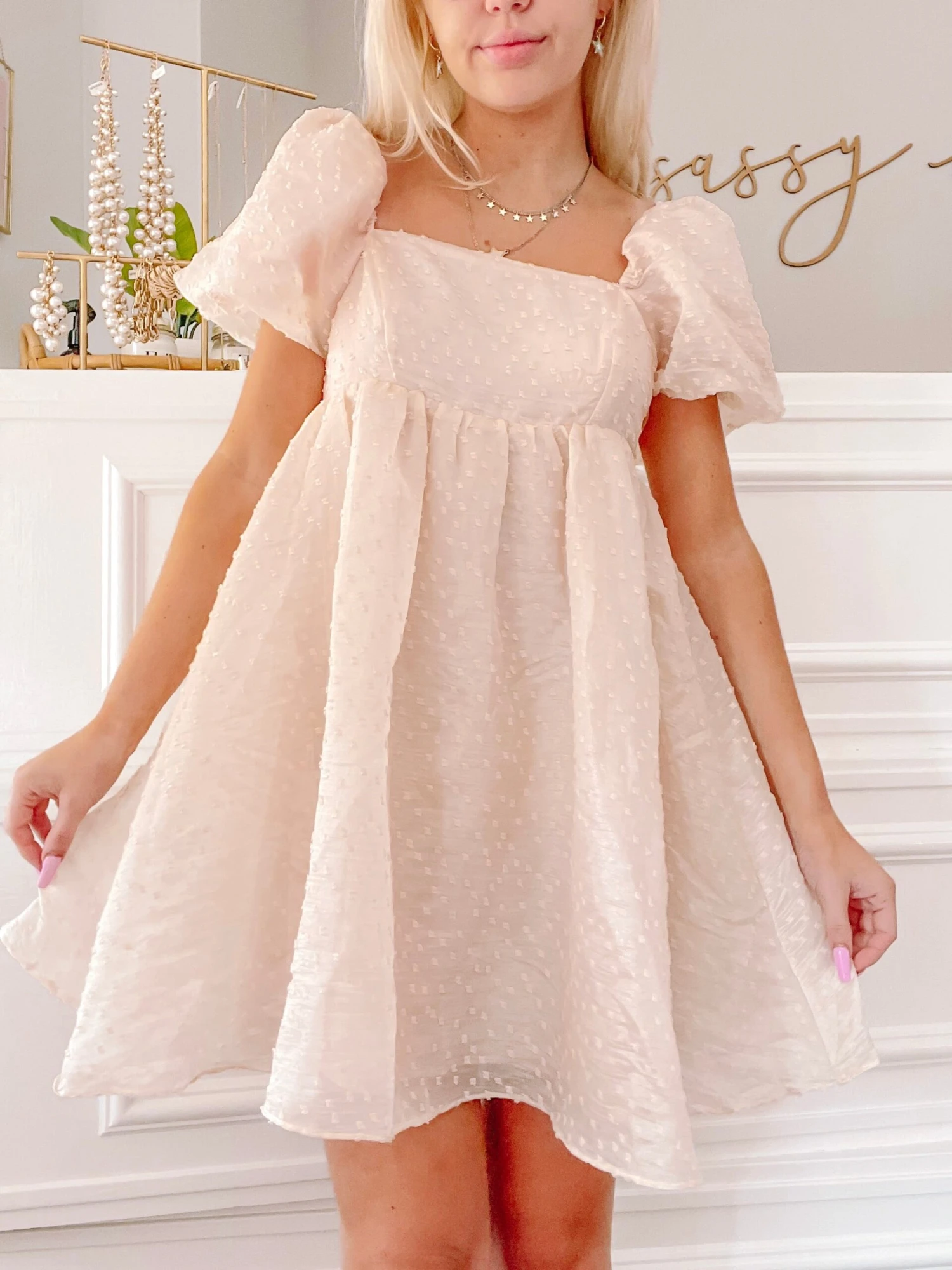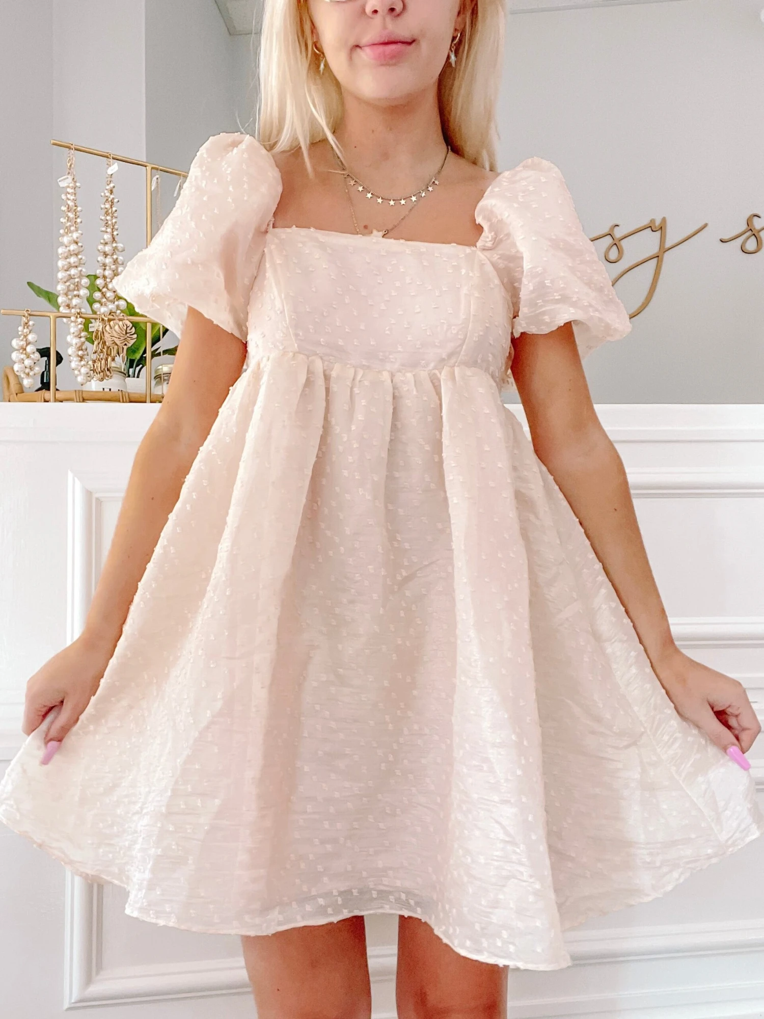 Our Princess Daisy Organza Dress is an oh so lovely, nude babydoll dress. Twirl around in this pastel pretty featuring a tulle skirt, puff sleeves, and swiss dot fabric. She is lined and has a hidden back zipper.