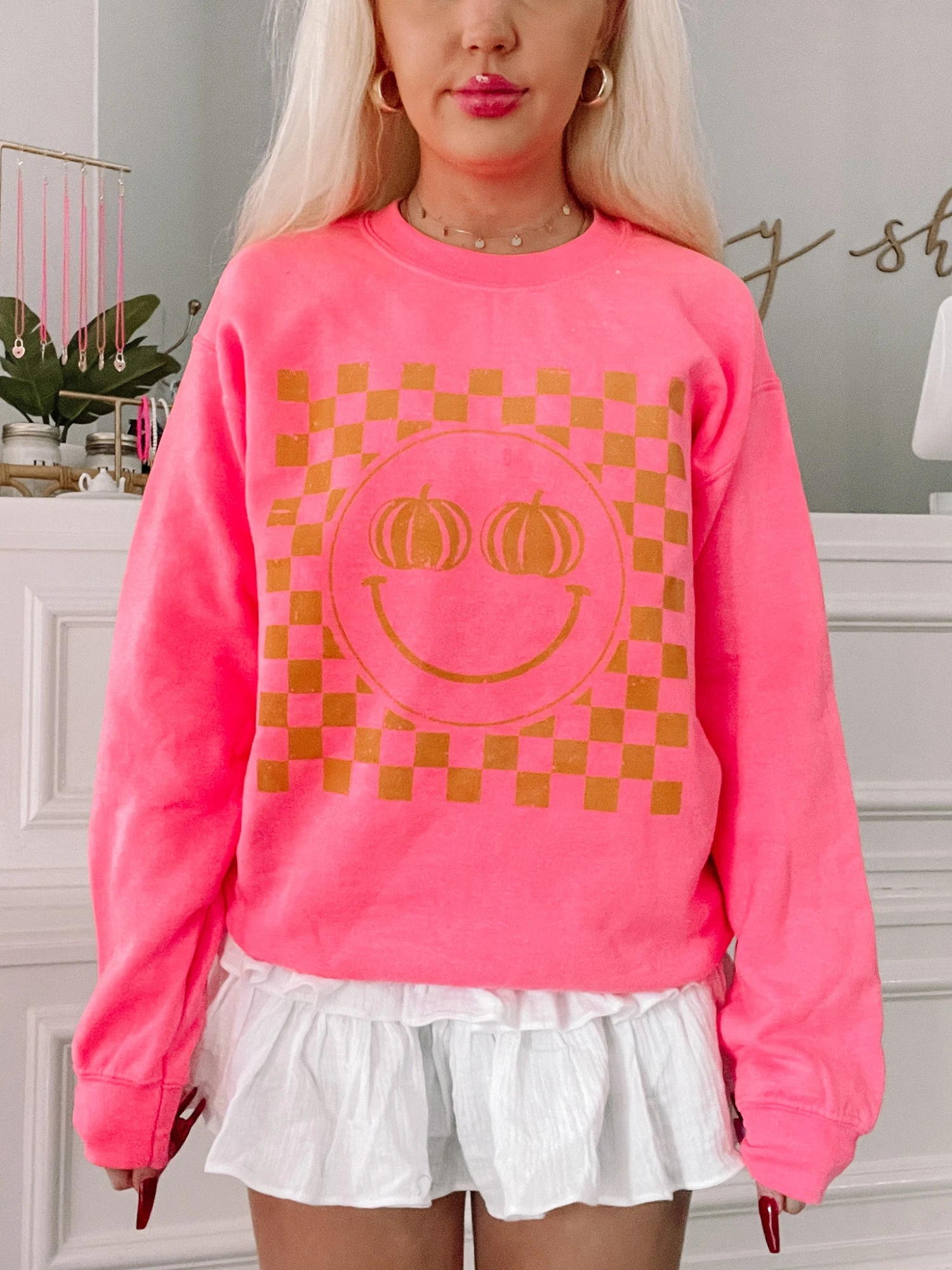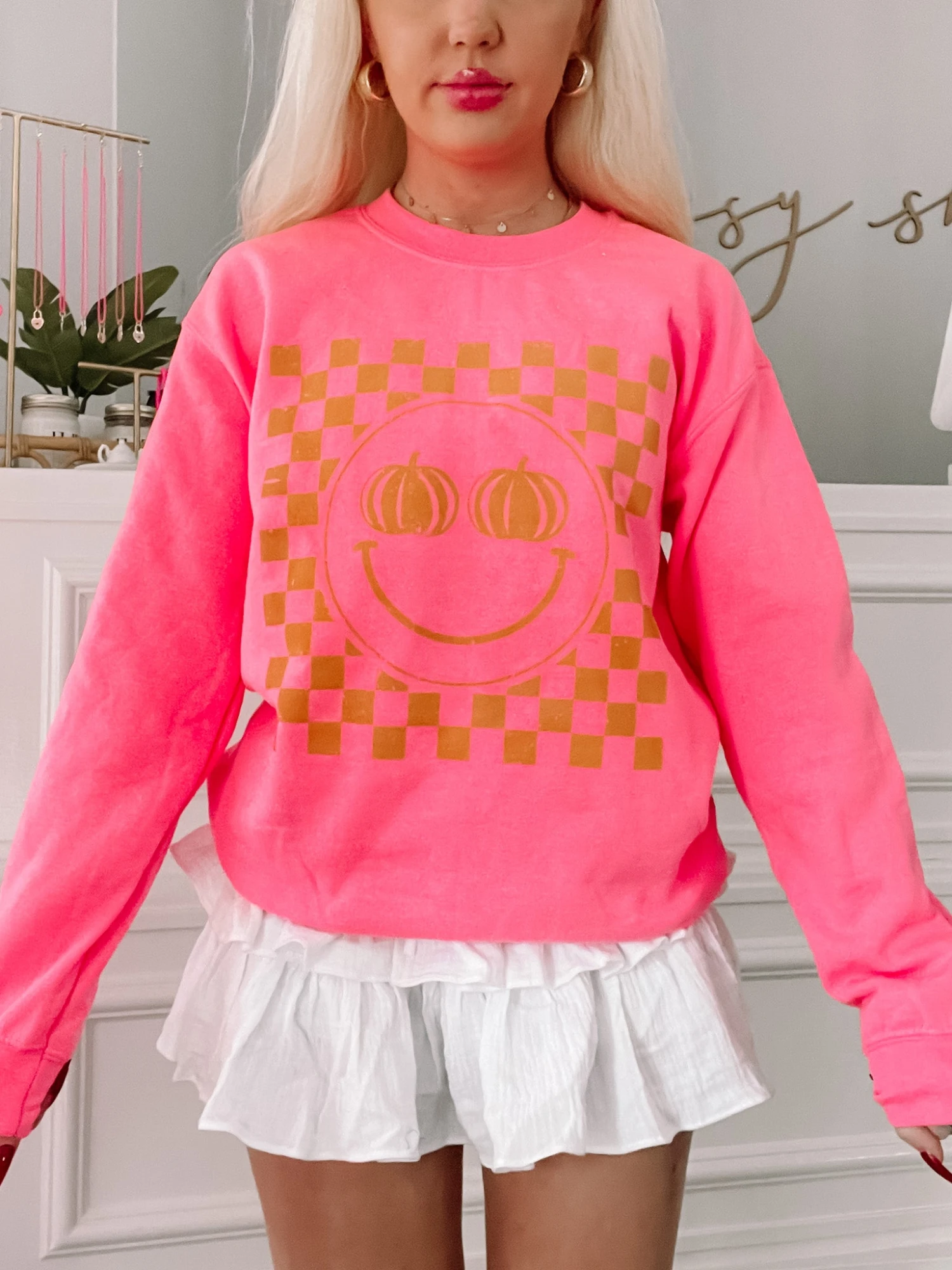Our Pumpkin Smiley Crewneck is a hot pink smiley face crewneck with soft fleece lining on the inside of the sweatshirt. The eyes of the smiley face are pumpkins.