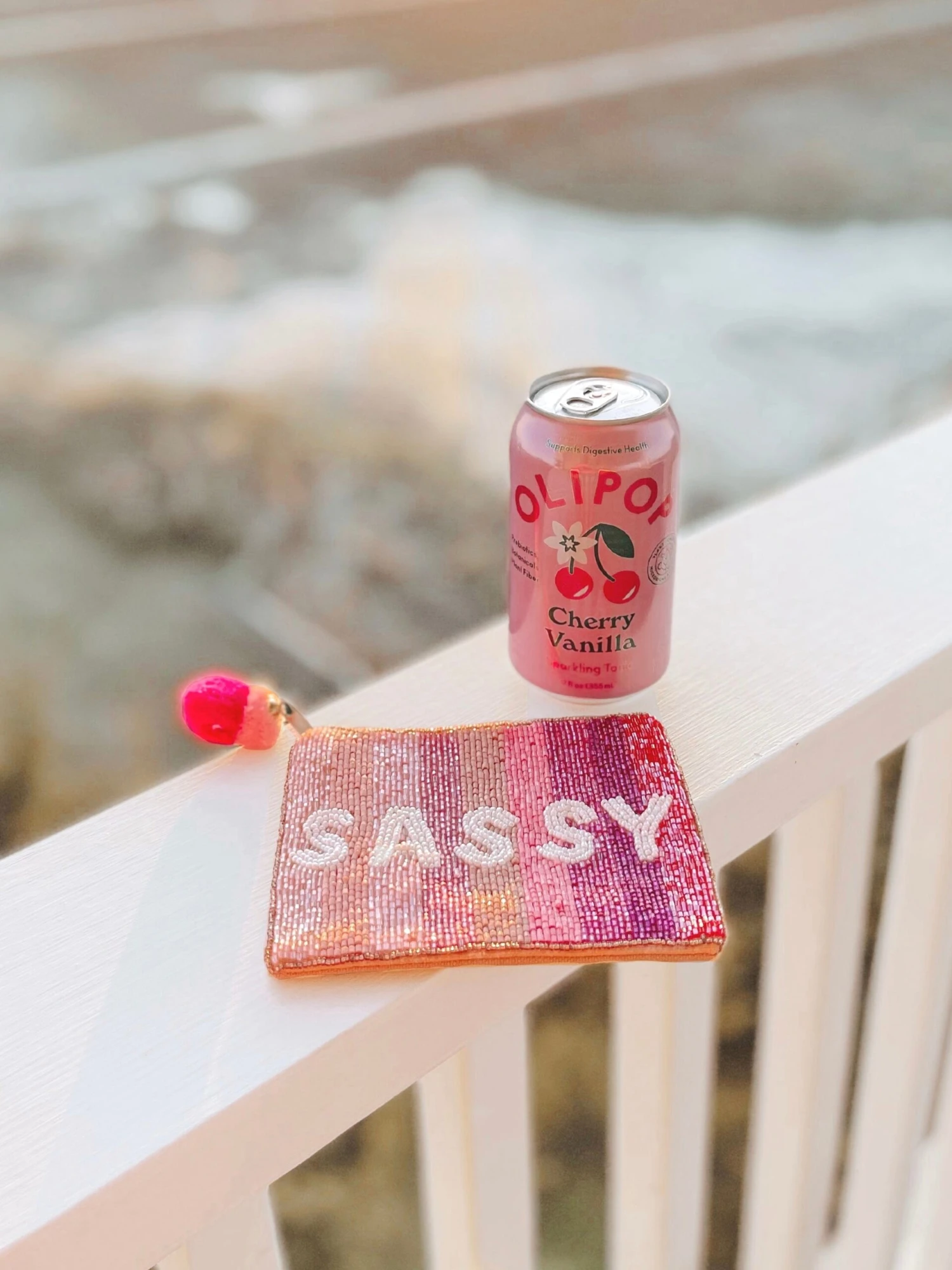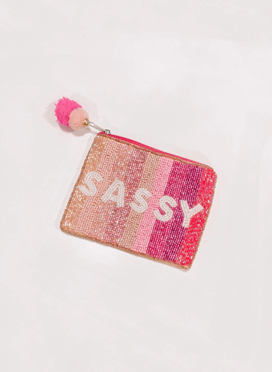 Our Sassy Beaded Pouch is a hand beaded coin purse. She features pink gradient stripes and the word sassy in white. She also has two pom poms on the zipper. She measures 5×3.5 inches and is perfect to grab on the go.