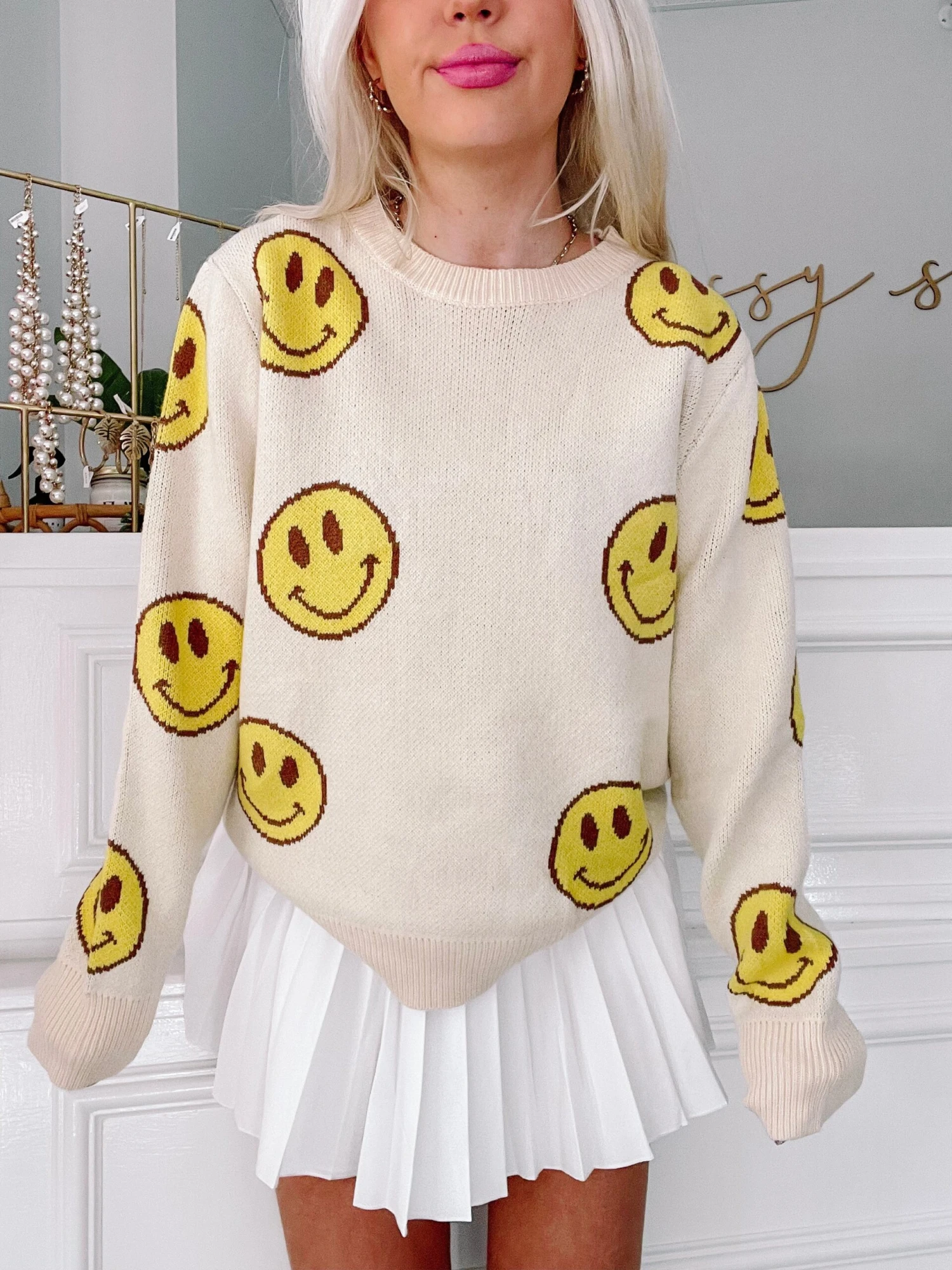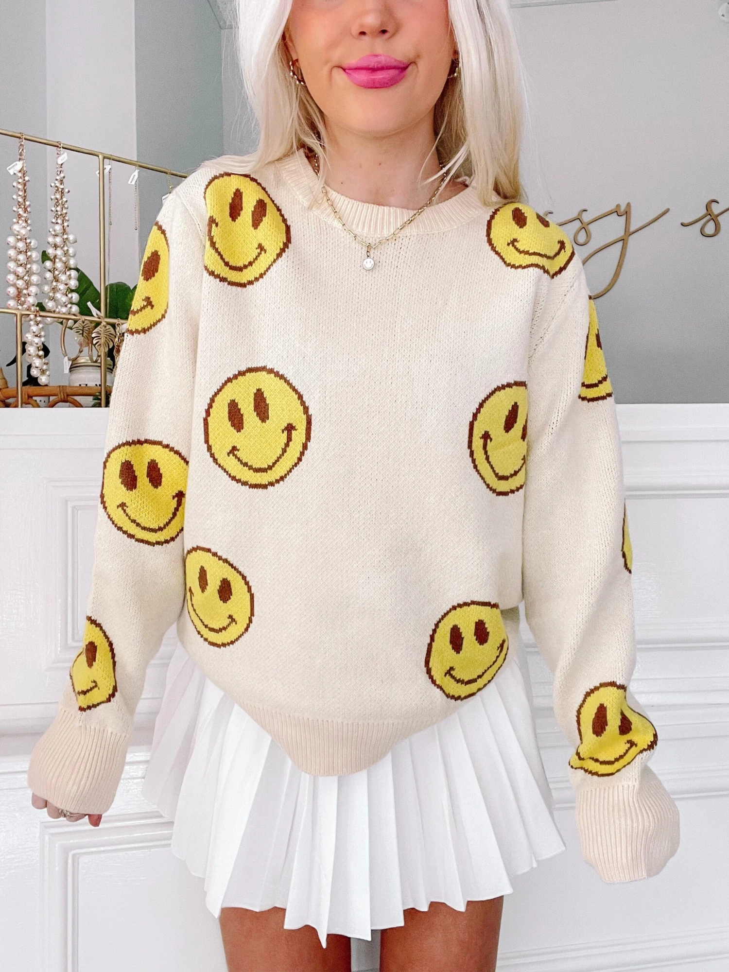 Our Smiles for Miles Sweater is cream smiley face sweater that’s nice and thick to be sure you stay warm on the cold days ahead!