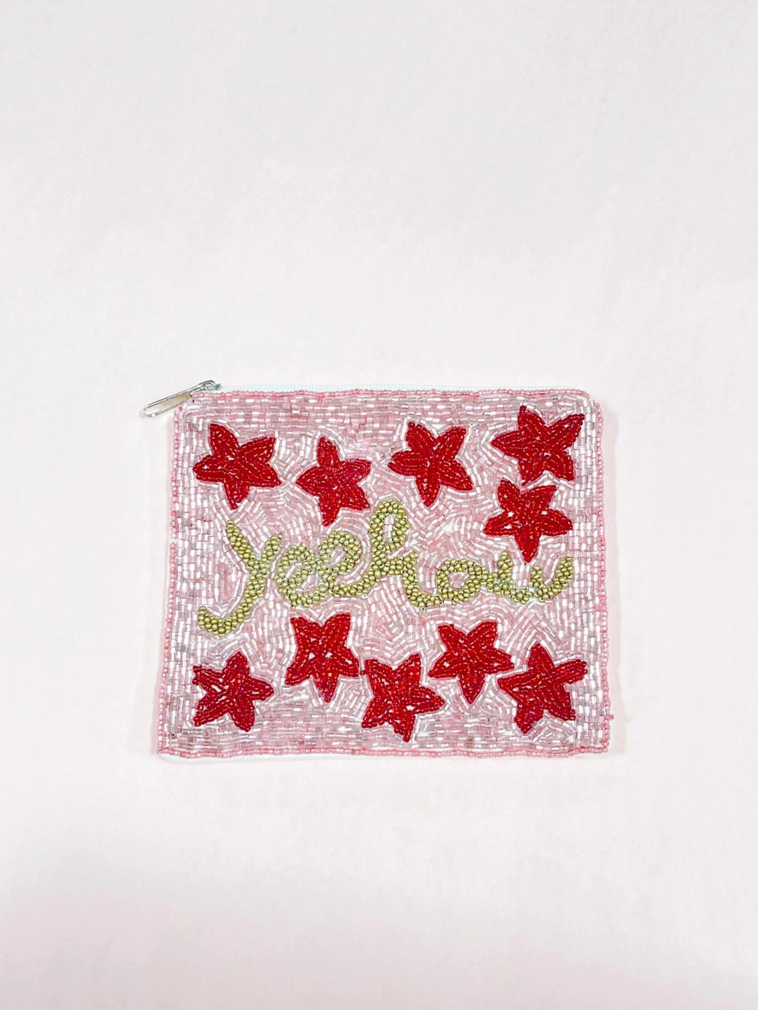 Our Yeehaw Beaded Pouch is a hand beaded coin purse. She features a pink background with red stars and a gold “yeehaw”. She measures 5×3.5 inches and is perfect to grab on the go.